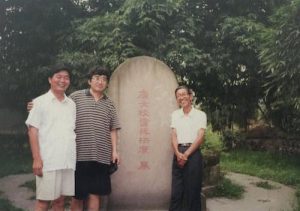 图:1999年于薛涛墓前:邓垦:(右)蔡楚(中)和谢庄(左)