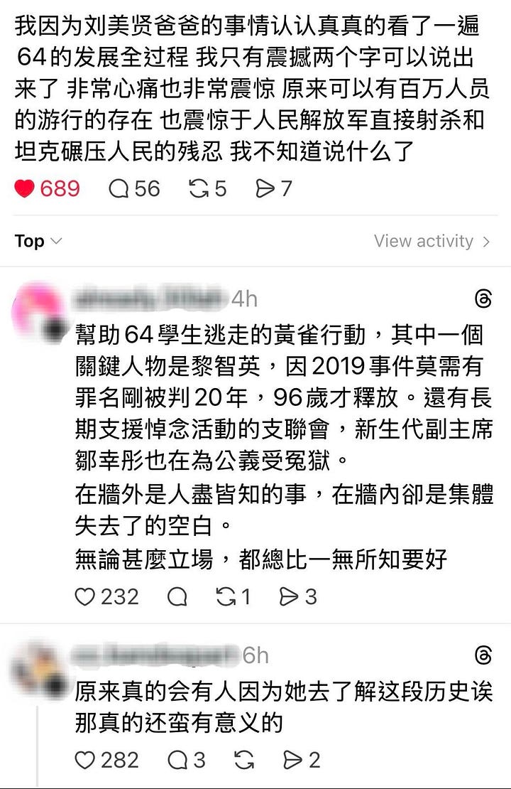在海内外社交网络平台,许多年轻网友表示:是刘美贤以及她的父亲刘俊的经历,让他们第一次认真去了解六四的来龙去脉。