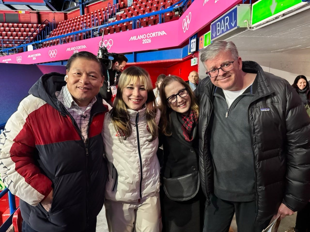 On left, Arthur Liu Jun poses with his daughter, Alysa, after her gold-medal-winning performance in Milan. (Image provided by Liu Jun)