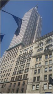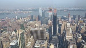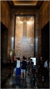 参观完华尔街,又乘车来到久负盛名的帝国大厦,帝国大厦有102层楼,高381米,楼顶有锥形尖塔,塔尖高443米。它从1930年3月17日开建,于1931年5月1日建成,平均每星期修建四层半,这在上世纪三十年代初是一种前所未有的建设速度。自它建成的1931年起直到1972年,它雄踞世界最高大楼宝座达41年之久。在它的第86层建有一个观景平台专供游人俯瞰纽约市容。我们走进楼内电梯之后,直接上升到第86层,走到观景平台上放眼四望,都是一眼望不到边、高楼林立的纽约市区,可见纽约市之大,确实不负世界第一大都会的盛名。第86层除四周的观景平台之外还设有餐厅、咖啡厅、商店等服务设施。由于旅游团只提供了到86层的门票所以未上到102层上去。