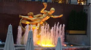 洛克菲勒广场喷泉上的盗火种给人类的普罗米修斯的鎏金塑像