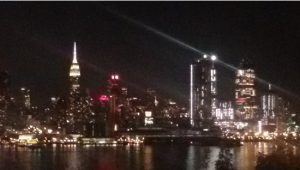 我们尽可能保持安静,从公园走到河边别墅区的铁栏杆旁,隔河观看曼哈顿灯火辉煌的夜景。隔河远看曼哈顿那五光十色的夜景与刚才在时代广场所感受到的那种喧闹、热烈、灯火璀璨的景色有着完全不一样的感受,当时的熙攘、热闹、灯火通明,已变成了现在的宁静与灯光闪烁。我们各自拍了一些遥望曼哈顿夜景的照片,又互相帮拍了自己隔河与曼哈顿夜景的合影。