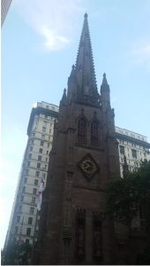 20号早餐后,又乘旅游大巴重返纽约市区参观,首先经过纽约著名的三一大教堂,它是英国基督教圣公会于1696年修建,原为木结构后被大雪压垮,现存的教堂是后来重建的。该教堂因其对面是才华横溢的美开国元勋之一的汉密尔顿的办公室,和教堂后面的墓地里埋葬着汉密尔顿而闻名于世。