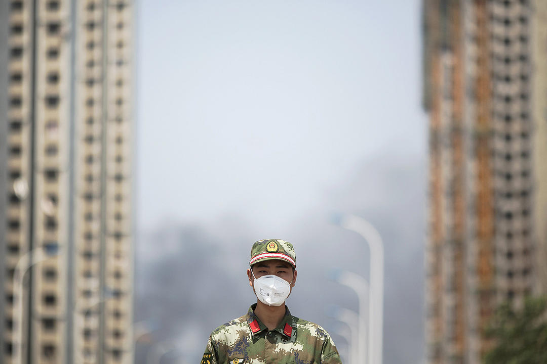 一名在天津的官兵戴上口罩指挥交通。 摄 : Damir Sagolj/REUTERS