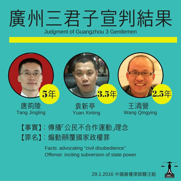 2016年1月29日,“广州三君子”的唐荆陵、袁新亭和王清营被控“煽动颠覆国家政权”罪成,分别被判5年、3年半及2年半。(中国维权律师关注组图片)