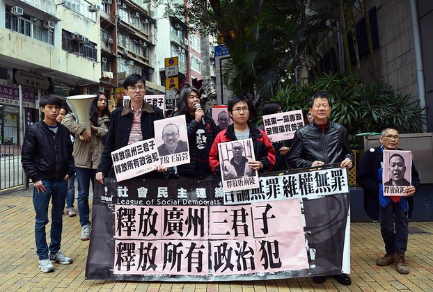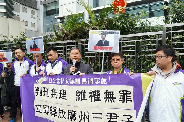 被称为“广州三君子”的唐荆陵、袁新亭和王清营,周五(29日)被判处有期徒刑2年半至5年。社民连多名成员,周六由西区警署出发,携同横额及标语游行至中联办,并沿途高叫“广州三君子无罪”等口号。