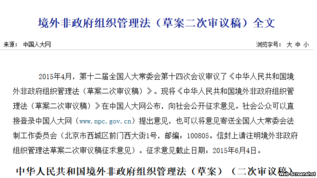 中国备受争议的境外非政府组织(NGO)管理法草案正在进行审议。人权组织自由之家发表声明对这部法律草案表示担忧。自由之家说,中国计划对非政府机构进行更为严格的管控。