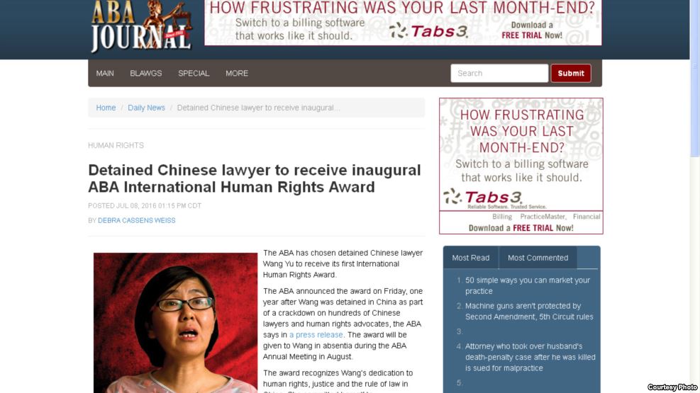 此外,曾被外界质疑在中国人权问题上比较低调的美国律师协会,特别选择709大抓捕事件一周年之际,宣布将首届国际人权奖授予首先被抓的北京锋锐律所的维权律师王宇,表彰她对中国人权、正义以及法治的奉献精神,以及对中国民权和公民自由的贡献,并于今年8月6日在旧金山举行美国律师协会年会上正式向王宇颁奖。