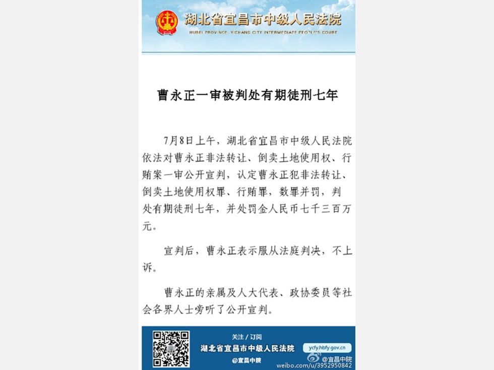 曹永正案7月8日上午由湖北宜昌中院宣判了,这个曾经审理了周永康之子周滨、之妻贾晓晔、之侄周锋的法院,再次因为周案受到了关注。