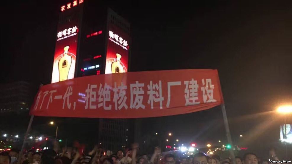从周日中午起,连云港警方派出大批警力在苏宁广场戒备,到傍晚开始有数以百计的人聚集,路口被堵。现场包括男女老幼的抗议民众高喊“反对核废料”。