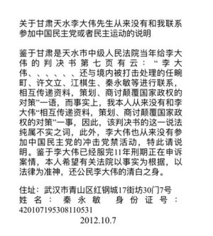 本人李大伟,1999年1月16日被以涉危害国家安全罪,被天水市国家安全局刑事拘留近一个月,后被连续两年多取保候审,2001年4月再次被天水市国家安全局以涉嫌危害国家安全罪为由刑事拘留,同年5月被以涉嫌颠覆国家政权罪为由逮捕。 后经天水市人民检察院起诉;天水市中级人民法院一审;甘肃省高级人民法院二审被以颠覆国家政权罪判刑11年,剥夺政治权利4年。