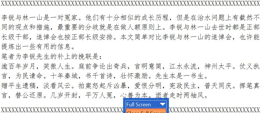 李锐与林一山是一对冤家。他们有十分相似的成长历程,但是在治水问题上有截然不同的观点和措施,最重要的分歧就是在做人额原则上。李锐与林一山去世时都是正部长级干部,追悼会也按正部长级安排。本文简单对比李锐与林一山的追悼会,也许能提炼出一些有用的信息。笔者为李锐先生的补上的挽联是: