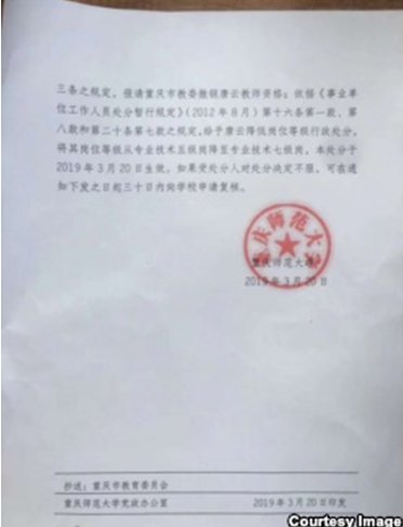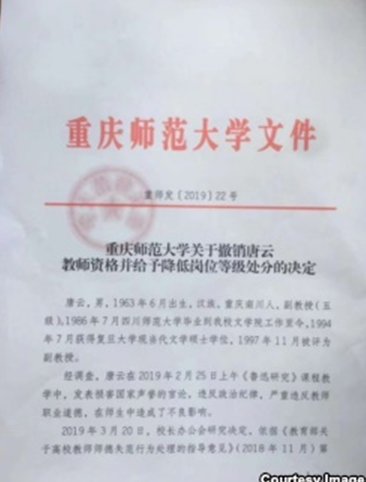 据悉,唐云是重庆师范大学近年第二位遭整肃的教师。该校涉外经贸学院副教授谭松2017年7月因从事红色历史真相调查而遭学校强行解聘。谭松的调查包括,川东长寿湖右派、川东土改、大地主刘文彩庄园收租院泥塑真相等,都涉及颠覆中共版本的历史。