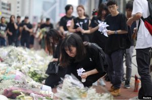 香港一名“反送中”年轻抗议男子星期六下午从金钟一处建筑上跌落身亡。有在场网民发推文称他是香港第一位“反送中”自杀明志的义士。今天下午1时许,在太古广场的现场,便有数百人排成长长的黑色人龙,默默将花束堆成一座白色的小山。游行队伍在行经事发地点时,人们纷纷以献花、鞠躬和上香的方式悼念。由于人数众多,队伍的脚步亦有放缓。