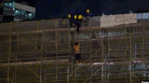 一名抗议者从太古广场大楼周围的施工脚手架上掉下来,当时消防队员正试图营救他。(2019年6月15日)。