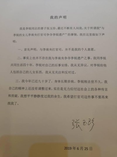 声明的第二条“事实上也并不存在我与李南央争夺李锐遗产之事……”从一开始我就明确申明:张玉珍争的不是李锐遗产,是李锐生前捐赠给胡佛研究所,属于胡佛的馆藏。张玉珍对李锐遗产有兴趣,我没兴趣,我不想为证明这又是张玉珍的谎言而多费笔墨。