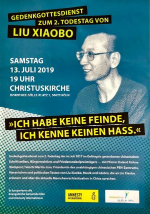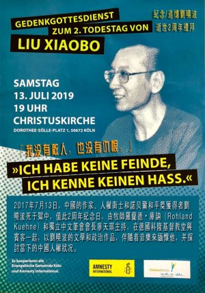 这个世界永远不会忘却刘晓波,由牧师罗兰德•库讷(Rohland Kuehne)和独立中文笔会会长廖天琪主持,在德国科隆基督教堂举办“‘我没有敌人,也没有仇恨’——祭奠与追忆刘晓波逝世2周年礼拜”,出席礼拜的嘉宾还有:林培瑞教授Perry Link(美国加州大学河滨分校)、科隆市副市长埃勒菲•朔-安特衛培斯(Elfi Scho-Antwerpes)等,该项纪念活动也得到了国际大赦组织和科隆基督教会的支持。这场礼拜活动将与宾客一起,以刘晓波的文学和政治作品,伴随着音乐来缅怀他,并探讨当下的中国人权状况。