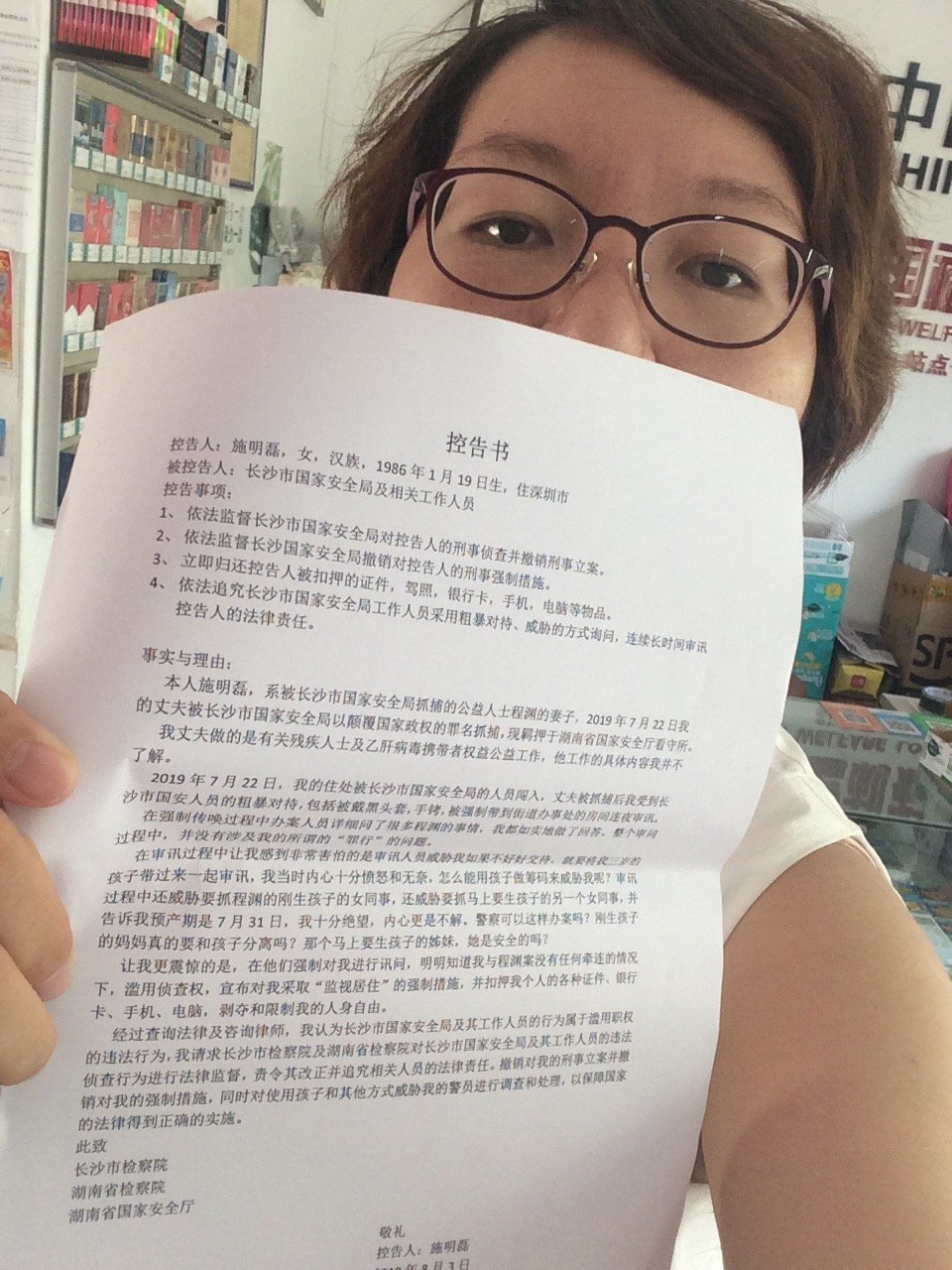 本人叫施明磊,系被长沙市国家安全局抓捕的公益人士程渊的妻子,2019年7月22日我的丈夫程渊被长沙市国家安全局以颠覆国家政权的罪名抓捕,现羁押于湖南省国家安全厅看守所。