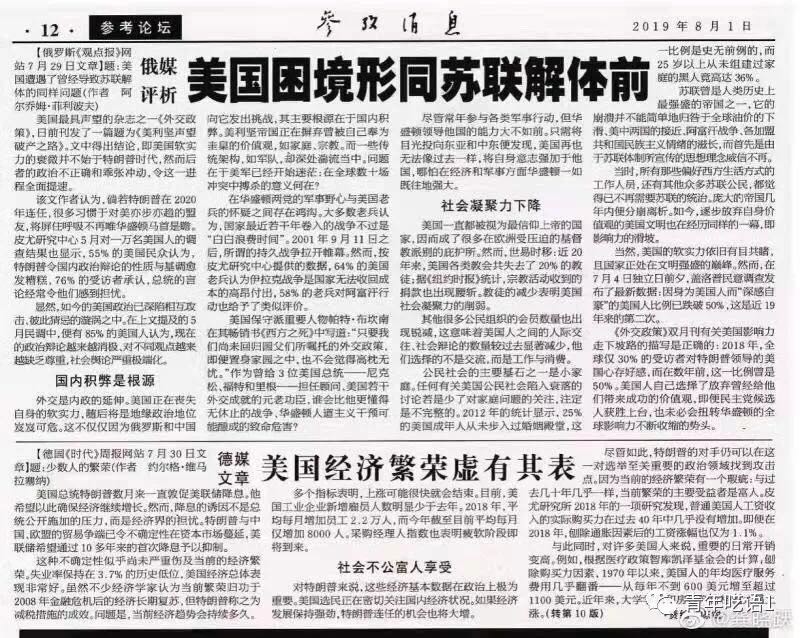 后来人民日报又搞了“九骂”,可有什么用呢,不伤美国一根毫毛。这两天,因川普宣布将在9月1日对另外3000亿进口中国商品加增10%关税,他们又难受死了,于是开足马力在央视上喋喋不休地骂。自己骂还嫌不够,还借俄罗斯媒体帮着骂。《参考消息》8月1日在第12版头条转发大块“俄媒评析”:《美国困境形同苏联解体前》,简直让读者“喷饭”。
