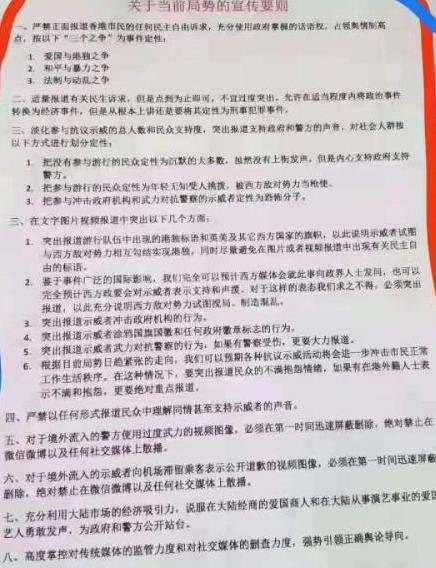 六、对于境外流入的示威者向机场滞留人员表示公开道歉的视频图像,必须在第一时间迅速屏蔽删除。绝对禁止在微信微博以及任何社交媒体上散播。