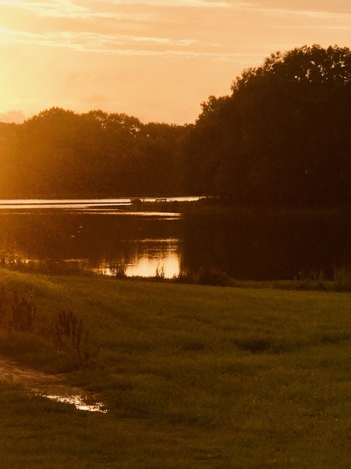 约8点,落日斜照在芦湖上,使芦湖像一湾流金的水。湿地边的湖水在余晖中色彩斑斓,仿佛出现一个安详的梦景。