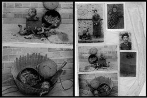 ‧這張照片,是當代中國良心歷史學家余習廣從湖南醴陵縣公安局的檔案裡找到隨後發佈出來的。照片顯示,父親劉家遠站在牆邊,手戴著鐵銬,身邊是他兒子的頭顱和骨架,還有一個鐵鍋,鍋裡面燉著他從快餓死的兒子身上割下來的肉,和胡蘿蔔一起燉,劉想在餓死前吃一頓肉。該照片由公安局拍攝於劉家遠被槍斃之前。