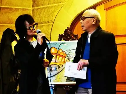 何与怀博士在《静静的海⽛》新书发布会发言,旁边是主持人淳子女士。