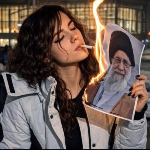 图片说明:伊朗抗议者焚烧阿里·哈梅内伊(Ali Khamenei)图像点燃香烟,以表达对独裁政权的蔑视。(图片来源于网络,拍摄者不详。)