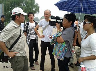 温榆河法庭庭审现场外,艾晓明采访围观声援者