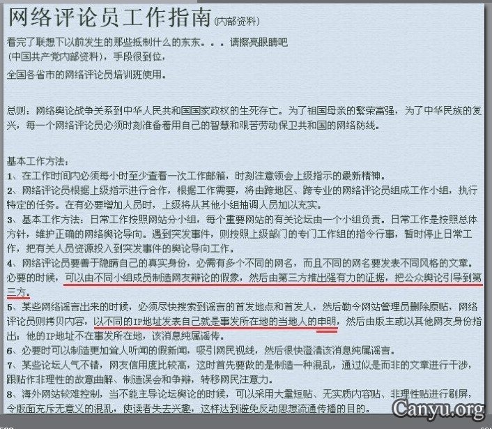 网络评论员(五毛)工作者指南曝光 发布者民主中国 | 8 月 26, 2011 | 时政, 本站首发 | 0 | (参与2011年8月26日讯)被网友戏称为五毛的网络评论员的内部工作指南日前曝光。该指南罗列了多种引导公众舆论的手段,譬如:“某些谣言出来的时候,必须尽快搜索到谣言的首发地点和首发人,然后勒令网站管理员删除原帖,网络评论员则拷贝内容,以不同的IP地址发表自己就是事发所在地的当地人的申明,然后以版主或以其他网友身份指出:他的IP地址不在事发所在地,该消息纯属谣传。