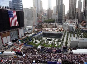 死难者的亲属、朋友以及纽约官员参加了在世贸遗址上新建的纪念园落成典礼。刻印着死难者名字的大幅铜版俯瞰着流进两个水池的瀑布。这个纪念园星期一对公共开放。