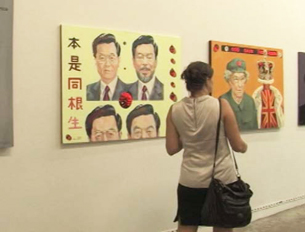 艾未未早年发表在自己部落格中的一幅作品《相煎何太急》,康定斯基又以油画呈现出来,把他自己和胡锦涛画在一起。