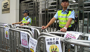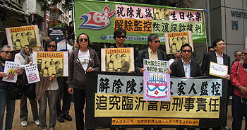 香港支联会及天主教正义和平会近20人,周五前往中联办请愿,要求中央政府解除对陈光诚及其家人的软禁。他们一齐戴上墨镜,在现场为陈光诚唱生日歌,并在绘划的生日蛋糕上写上祝福语。