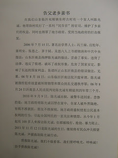 中国维权网星期三(11月9日)的报道称,近日,陈光诚的家乡山东临沂双堠镇东师古村邻村的营后村、小埠村和前崖子村等地的村民,有多人家中收到一封《告父老乡亲书》。信中称:东师古村盲人村民陈光诚因为帮助当地村民打官司,得罪了地方政府,被沂南县人民法院以莫须有的罪名判刑4年零3个月。更让人气愤的是,2010年9月9日,刑满出狱后陈光诚仍被地方政府囚禁在家中,全家人被外界隔绝。
