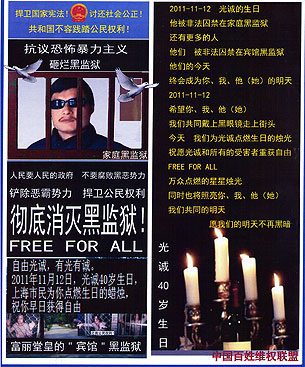 2011年11月12日是陈光诚的生日,继续将有民众冲关探望陈光诚,声援救助陈光诚行动。
