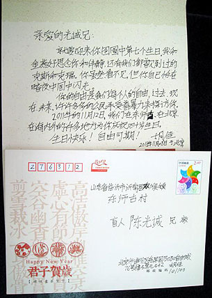 不过,与此同时,声援陈光诚的行动持续。各地的网友、维权人士包括胡佳等,陆续为陈光诚寄上生日贺卡。