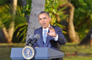 夏威夷本地时间13日下午4点多,美国总统奥巴马在海边万豪酒店召开露天记者招待会,对APEC峰会做总结性发言,来自世界各地的100多名记者到场,韦石和赵岩以博讯名义获准参加。