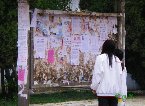 | 临沂大学的同学在海报栏前看网友刚贴上去的《告临沂市父老乡亲》 |