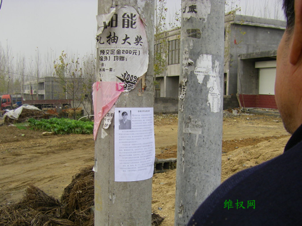 4、13:30我们在双堠镇以北的回龙庙村附近下车时,并没有见到警车或打手。也许陈一误判,也许“专员”相信了我们漏洞百出的说词。一下车,我们就把第8张广告帖到了国道边的一堵墙上。国道西侧有一条岔路,通往汪家庄。我们离开公路,沿这条岔路前进。很快,电线杆子出现了。