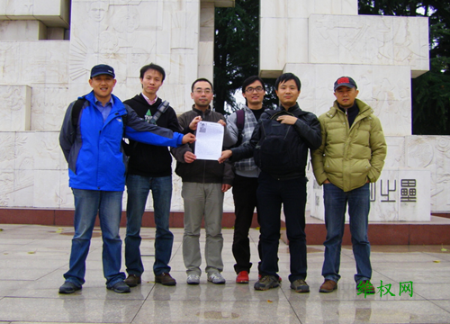 | 六网友在临沂大学校门内公共雕塑–文明之垒前手持《告临沂市父老乡亲》书合影 |