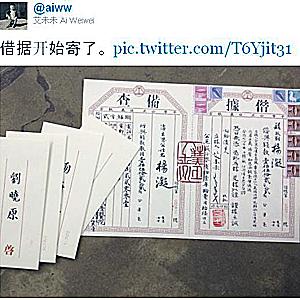 艾未未星期三凌晨发表推文,宣布已经开始向其三万债主邮寄借据。据已经收到借据的网友(栀子)描述,借据上汉字和纹饰的设计赏心悦目,郑重而优雅。艾未未在其推特说,这些借据是他一笔一画写成的,有十多道工序,因为债主甚多,他至少要寄半年。