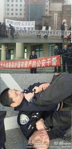 图片说明:11月16日,一群警察在河南省高院门口,拉开横幅喊冤:“河南法院无法无天;枉法裁判,警察蒙冤;栽赃陷害,法院枉法”等,同样遭到暴力对待。
