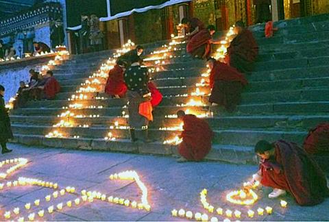 中国四川阿坝藏族羌族自治州的僧侣1月23日在一所寺庙点燃蜡烛为藏人祈福