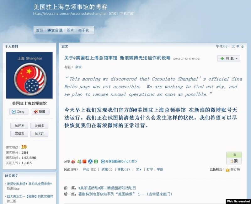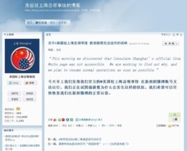 美国驻上海总领事馆7月12号在其新浪博客上表示,“今天早上我们发现我们官方的@美国驻上海总领事馆在新浪的微博帐号无法运行。我们正在试图搞清楚为什么会发生这样的状况。我们希望可以进快恢复我们在新浪微博的正常营运。”