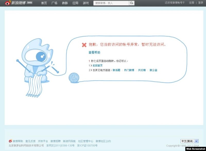 美国驻上海总领事馆的新浪微博,在7月12号忽然被取消。美国之音记者在美国时间7月13号上午5点试图访问其帐号,仅出现“抱歉,您当前访问的帐号异常,暂时无法访问”的字样。