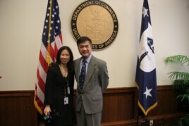 骆家辉与美国之音记者合照(美国之音记者 张蓉湘拍摄)国务院发言人努兰说:“我们深切关注藏人的自焚事件,以及自焚事件所凸显的怨气。美国不断敦促中国政府与藏人就他们的民怨直接对话。”
