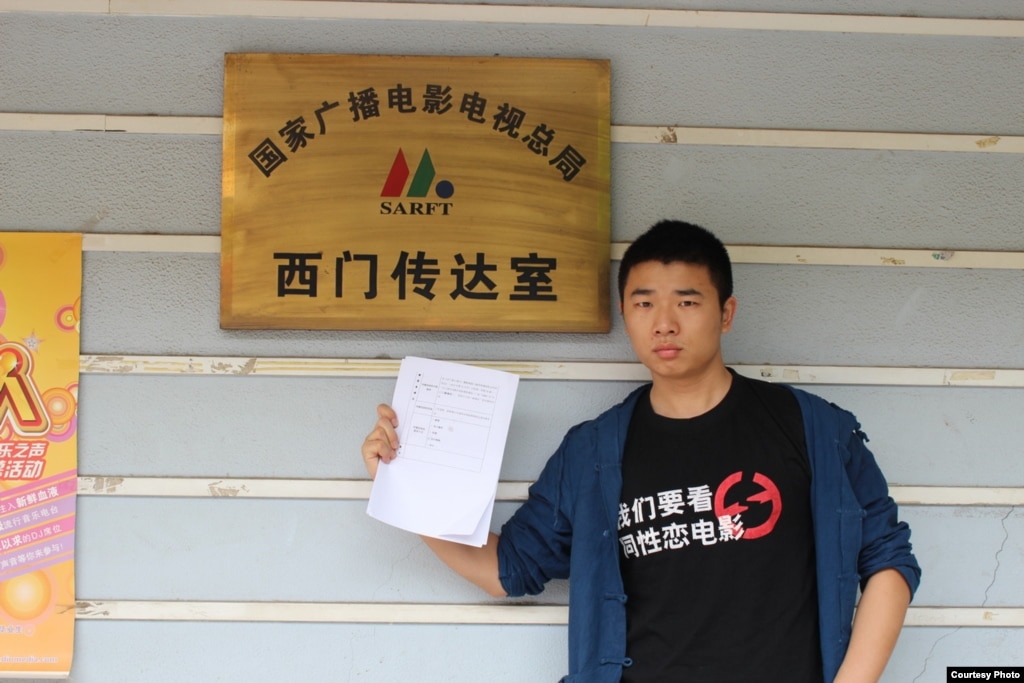 5月17日上午独立电影人范坡坡身穿“我们要看同性恋电影”的T恤衫来到国家新闻出版广电总局办理信息公开申请手续,希望了解现行电影审查制度,特别是对同性恋题材的相关规定。
