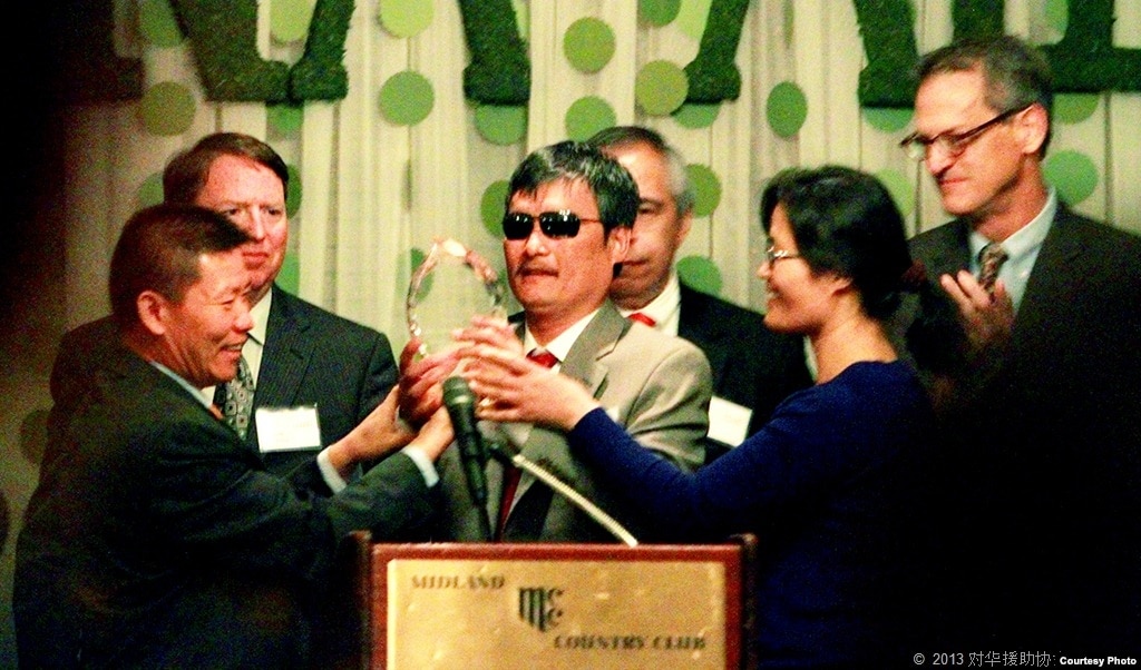 对华援助协会会长傅希秋(左一)把捍卫自由勇气奖颁发给陈光诚(中)。