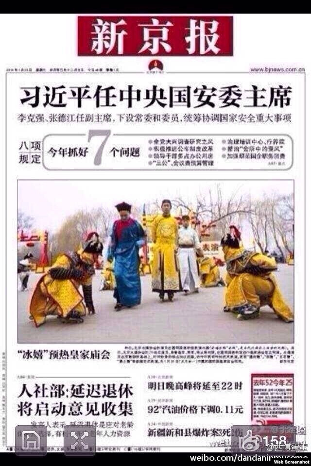 新浪网管屏蔽了一些它们认为是负面的相关评论,比如:西博蛋蛋:混搭要出事:今天的新京报估计要摊上大事儿。主标题:习近平任中央国安委主席。正下方乱入一张一群奴才给皇帝跪拜的大图。这要不是脑子进水, 就是严重的政治事故啊……@鞋楦儿 你说呢? 这版面语言有意思……查看全文>>