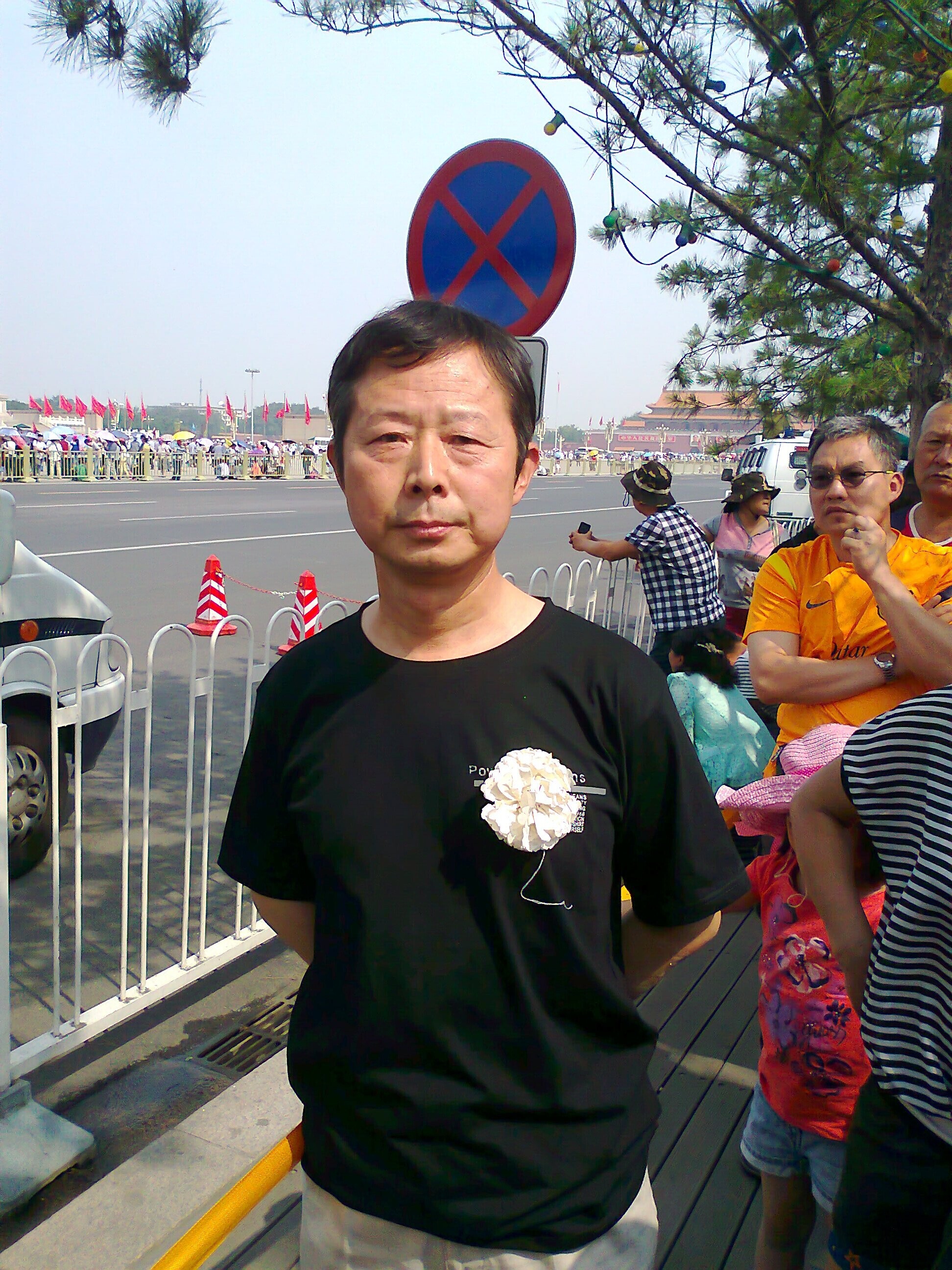 我走进游客队伍,里面有许多导游带领、举着小旗、戴着统一帽子的中外旅游团,我站在一个来自欧洲某国(国别在此隐去)的旅游团后面排队,这些五十多岁的人像是几对夫妇,我用简单的英语,连说带写地和他们攀谈。得知我是当年六四的参与者,那个留着短须的胖先生赞许地点头,用本国语言说了几句话,那个导游姑娘听了马上严肃起来,我问姑娘他说的什么,她闭口沉默,不敢翻译。我请胖先生用我的手机,以广场为背景,给我照了张像(图一)。过了一会儿,发现人群挡住了警察的视线,我赶紧掏出白花戴在胸前,请他又照了一张(图二),照完后我赶紧摘下来,向他连声道谢……